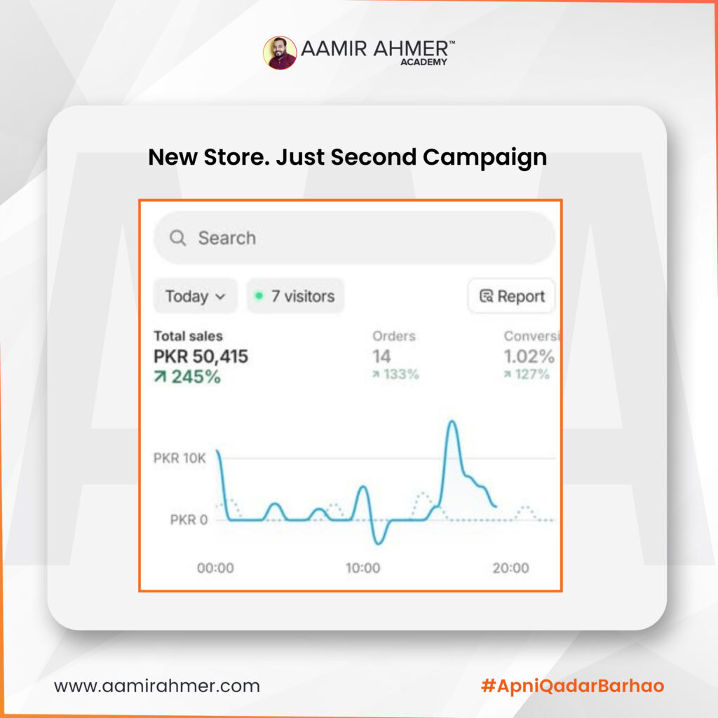 Unho ne sirf 3.5k daily budget par 14 orders generate kiye. Unka conversion rate raha 1.02% aur total sale hui 50,415 PKR ki. Ye aam baat nahi hai, kyunke ye sab mumkin hua un stories aur inspirations ki wajah se jo unho ne academy ke zariye dekhi aur implement ki.