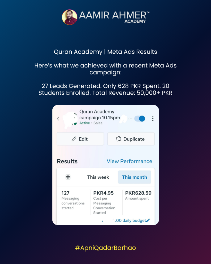 Aisi situation mein hamare student Syed Mehdi ne risk lene ka socha aur isi confusion mein unhone pehli dafa apni Quran Academy ke liye Meta Ads run karne ka faisla kiya. Aur decide kiya ke sirf 628 PKR ka ek experiment karte hain.