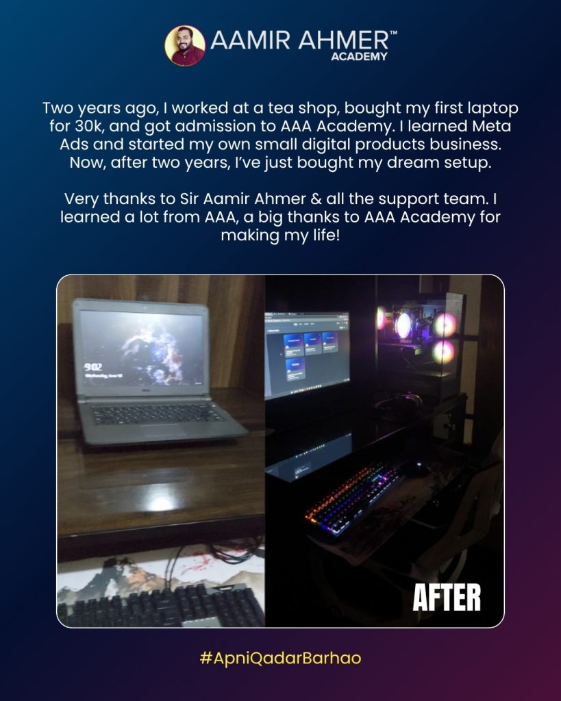 Wo kehte hain, 2 saal pehle jab wo kuch bhi nahi the, apni basic needs poori karne ke liye chai ki dukaan par kaam karte the. Us waqt unko apne future ka koi idea nahi tha. Phir unhon ne Aamir Ahmer Academy ke bare mein suna. Course join karne ke liye unho ne 30k ka laptop purchase kiya taake seekhne mein koi rukawat na aaye.