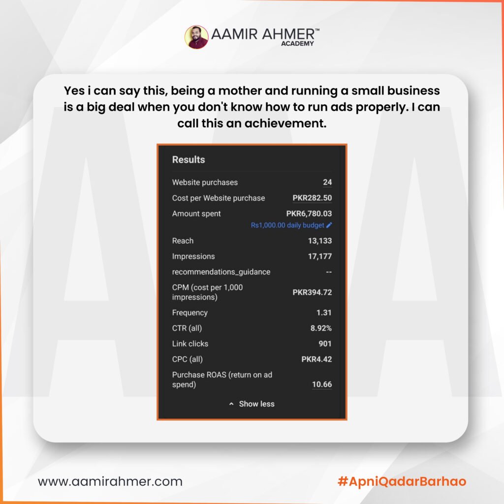 Ye hamari aik student, a proud mother k small business k facebook ads k results hein.